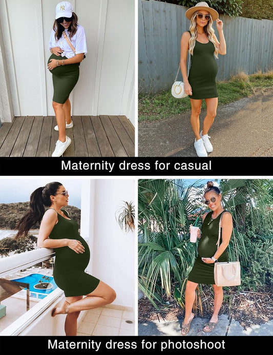 "B Shape Side Ruch Maternity Tank Dress/Bodycon Midi Dress for Everyday Wear Baby Shower