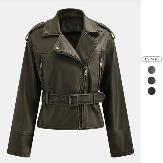 Katchme Womenswear Epaulets Zipper Belt Decor PU Biker Jacket Coats,Outerwear Jacket,Ladies Biker Zipper Pocket Clothes Womenswear