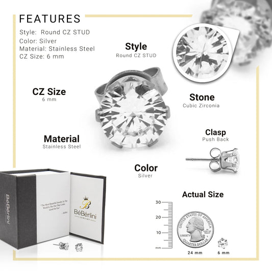 Women Stud Earrings Cubic Zirconia Silver Stainless Steel Jewelry round 6 Mm