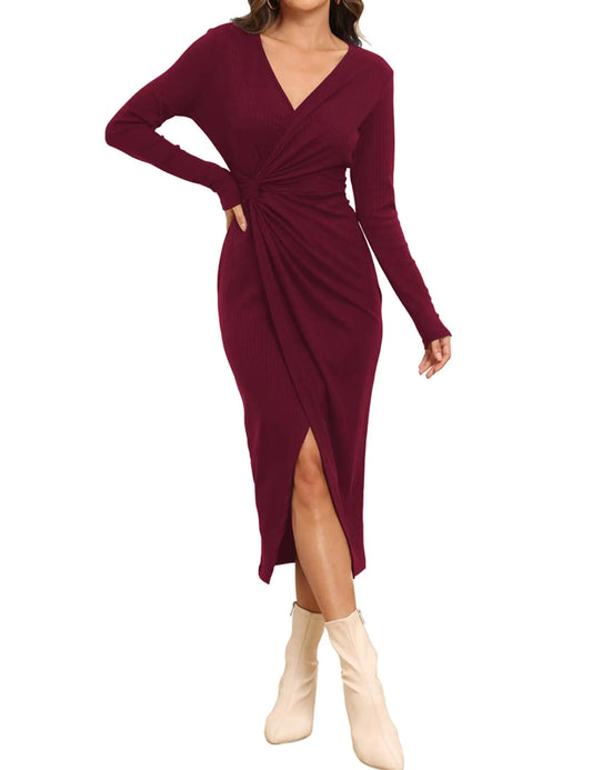 Hount Women Winter Wedding Sweater Dresses Elastic Slim Fit Cocktail Party Evening Long Dresses with Slit (Wine RedM)