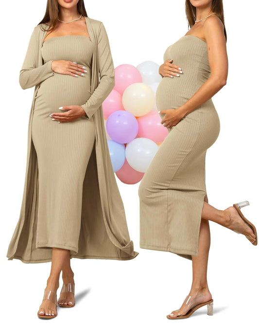 Rnxrbb 2 Piece Maternity Dress Cardigan Baby Shower Wedding Guest Summer Maxi Photoshoot Tube Maternity Dresses Bodycon LongOatmeal XL