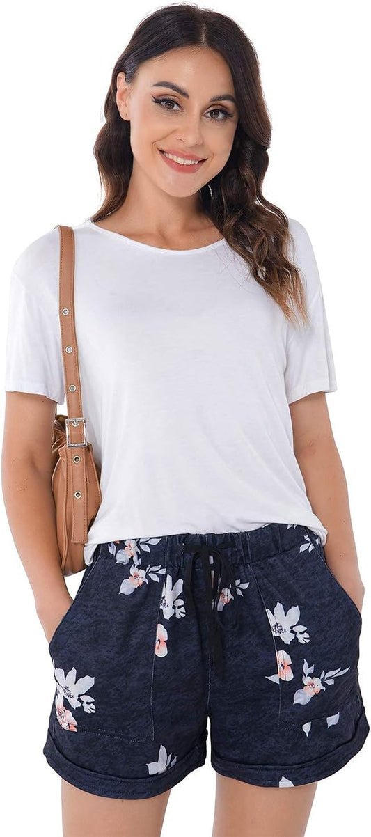 Women Summer Shorts Drawstring Comfy Casual Workout Cotton Linen Elastic Waist with Pockets Shorts 312 Floral-M