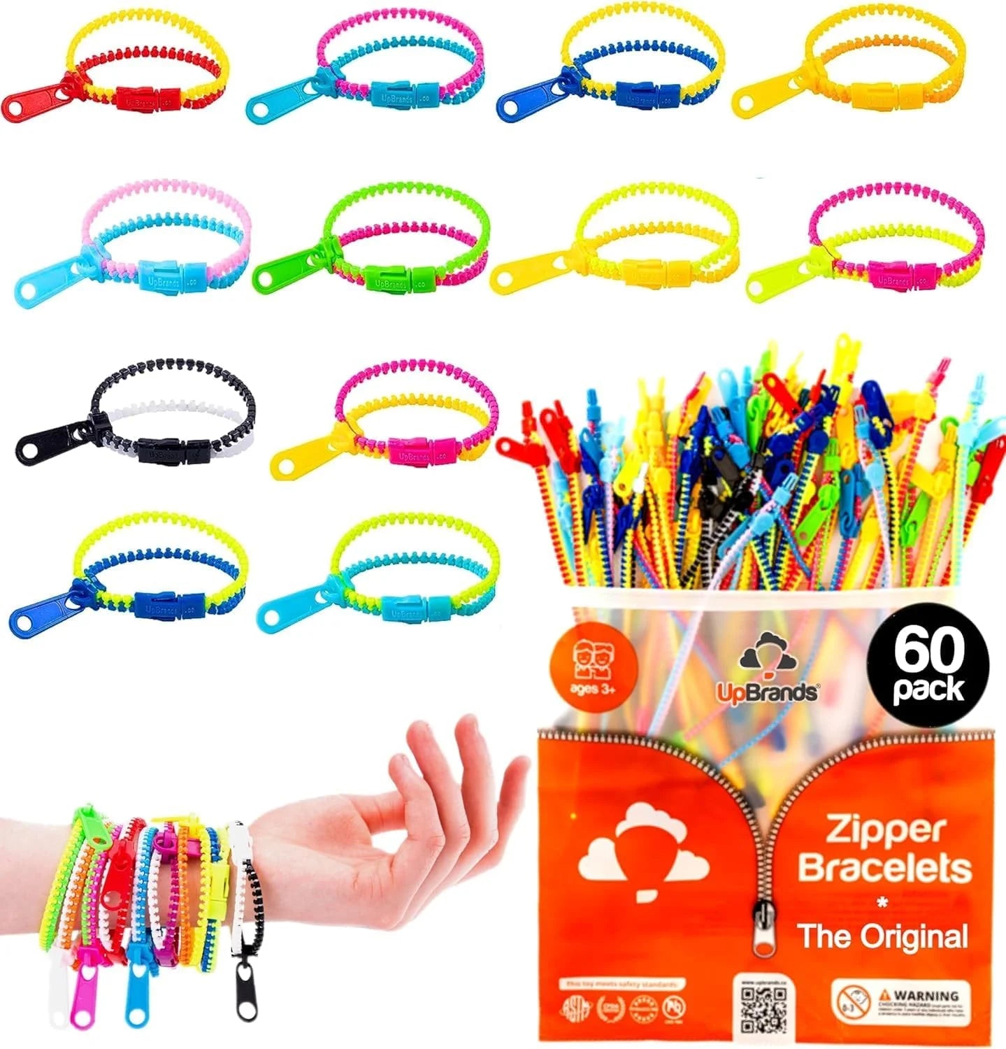 - UpBrands 60 Pack Fidget Zipper Bracelets Sensory Toy - an excellent kit for birthday party favors for kids. They are a very popular party favor hot toys for your child's Birthday party. Children will play with these plastic bracelets fidget jewelry and will love to share them in goody bag stuffers. Sensory Figit Stress Relief Toys for Special Needs Children. Perfect for killing time, anti-stress, better focus, ADHD, or autistic children.