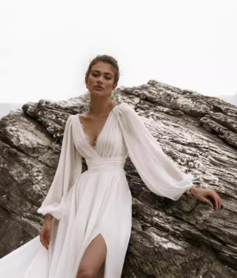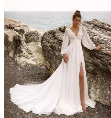 Step into your dream wedding with our stunning Beach Boho Wedding Dress. This exquisite bridal gown features a charming puff sleeve design combined with a graceful V-neck, perfectly blending elegance and comfort for your special day.
