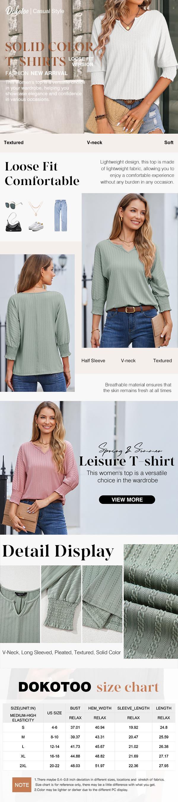 - Features: Dressy Casual Blouses, Loose Fit; Solid Color T Shirts; 3/4 Sleeve, Basic Tees; Small V Neck Design; This summer tops are featured in an loose fit and Pleated sleeve design with sew seaming front for a fashion look.