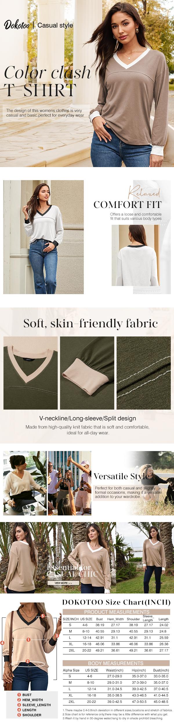 - Features:Classic v-neck shirts,long sleeve,color block in neckline and sleeve cuff,soft fabirc,basic tees,solid color tops,tops for Leggings and everyday wear