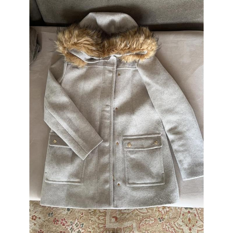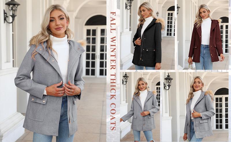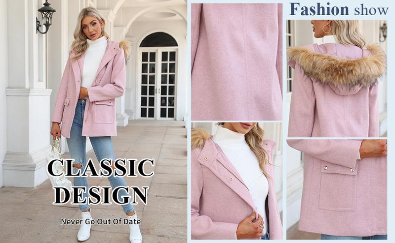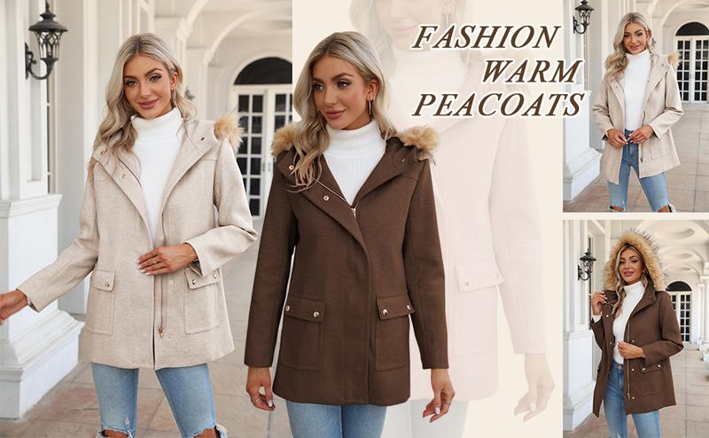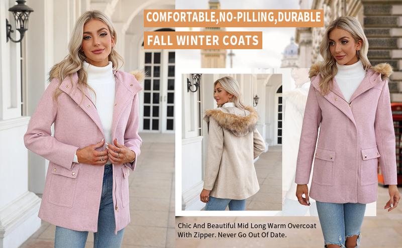 Goranbon Womens Coats Fall Winter Mid Length Thick Warm Pea Coat Elegant Faux Wool Coat with Detachable Hat Jacket Outerwear