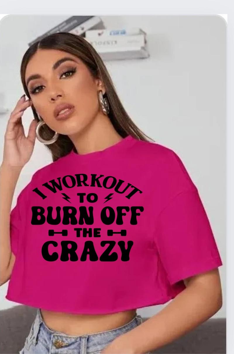 GYMANIAK 8 INCH WOMENS SHIRT CROP TOP "I WORKOUT to BURN off the CRAZY" Lady Comfort Streetwear Casual Clothing Comfortable Cotton Fit Womenswear