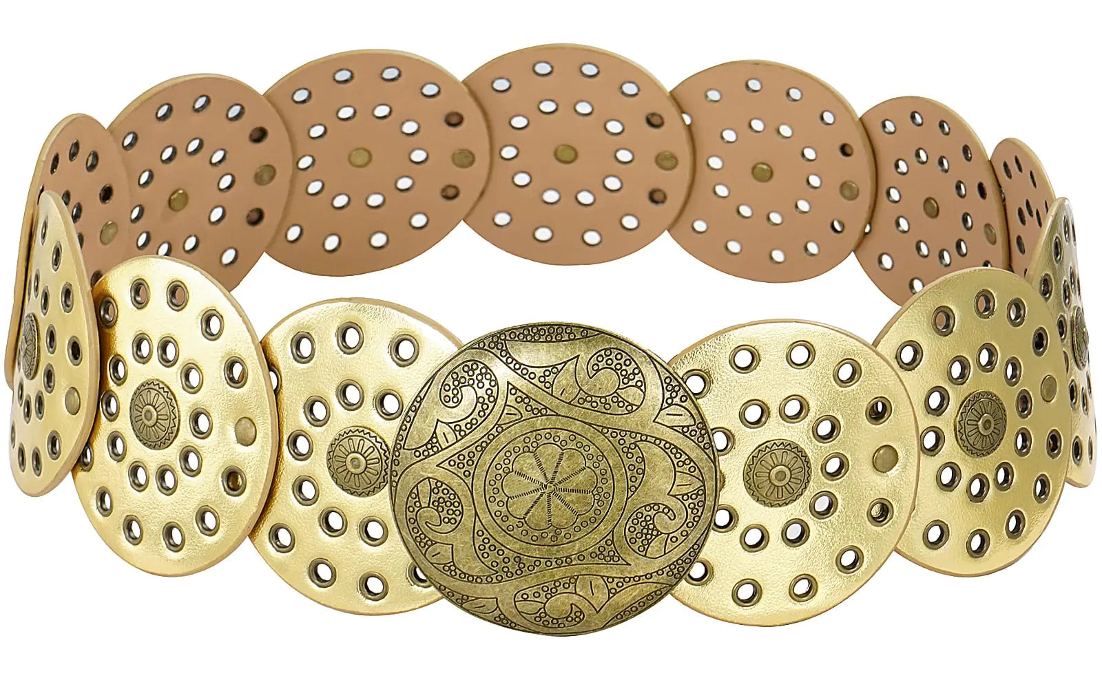 HIQUACC Wide Disc Belt for Women Vintage Leather Hollow Out Round Belt Western Waist Belt (Copper Gold XL)