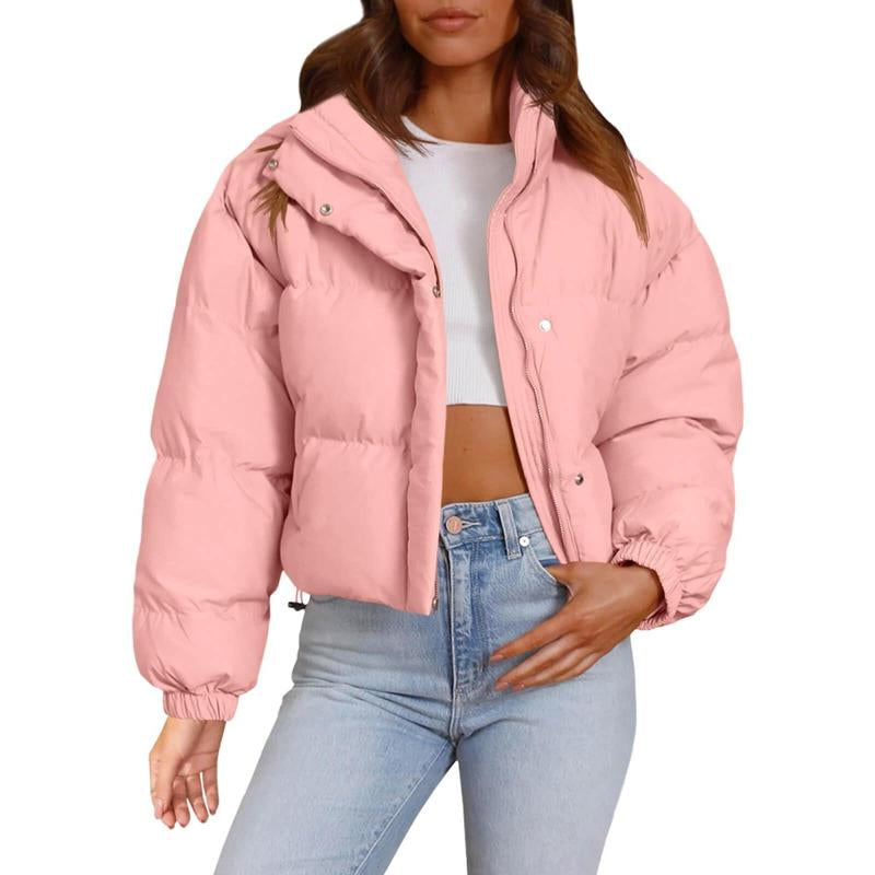 - Features: Cropped length puffer jackets for women, zip up front, two side pockets, long sleeve, stand collar, drawstring feature on waist, silver press stud buttons up front, chic and warm.