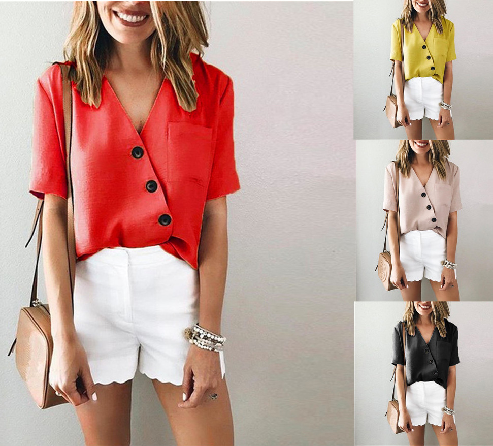 Elevate your wardrobe with our stunning V-neck button-up shirt featuring a unique asymmetrical pocket design. Crafted from a luxurious blend of acetate fiber, this shirt not only offers a sleek appearance but also ensures all-day comfort.