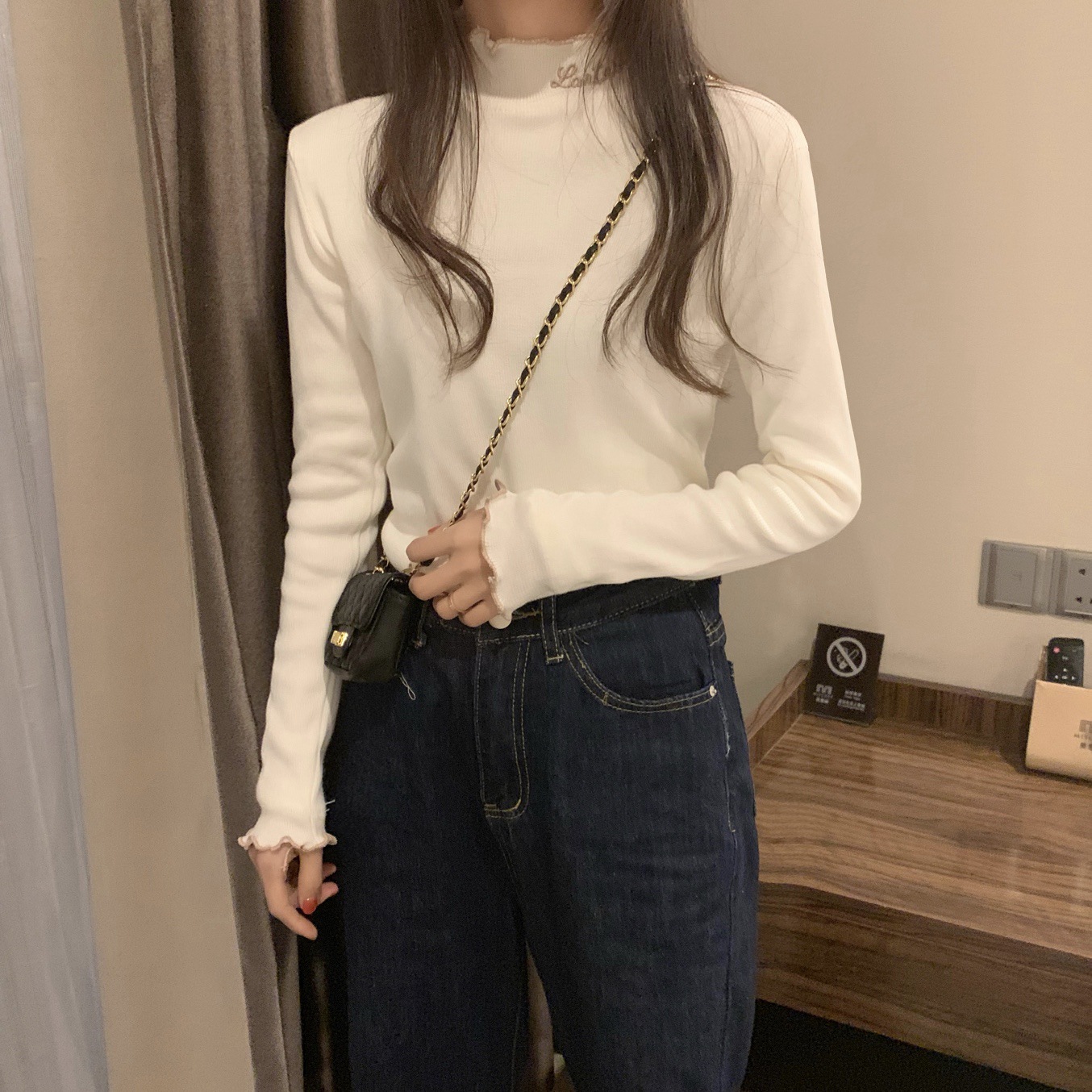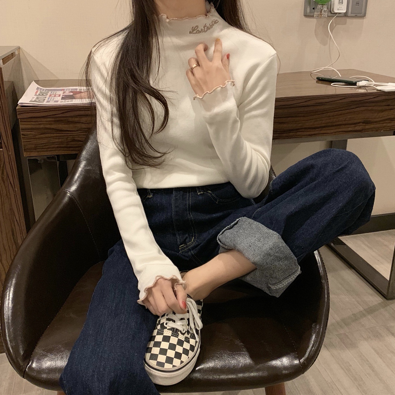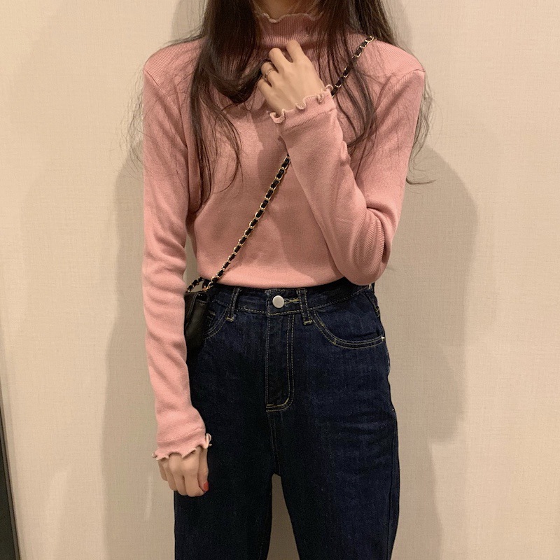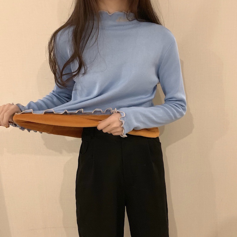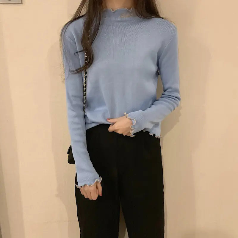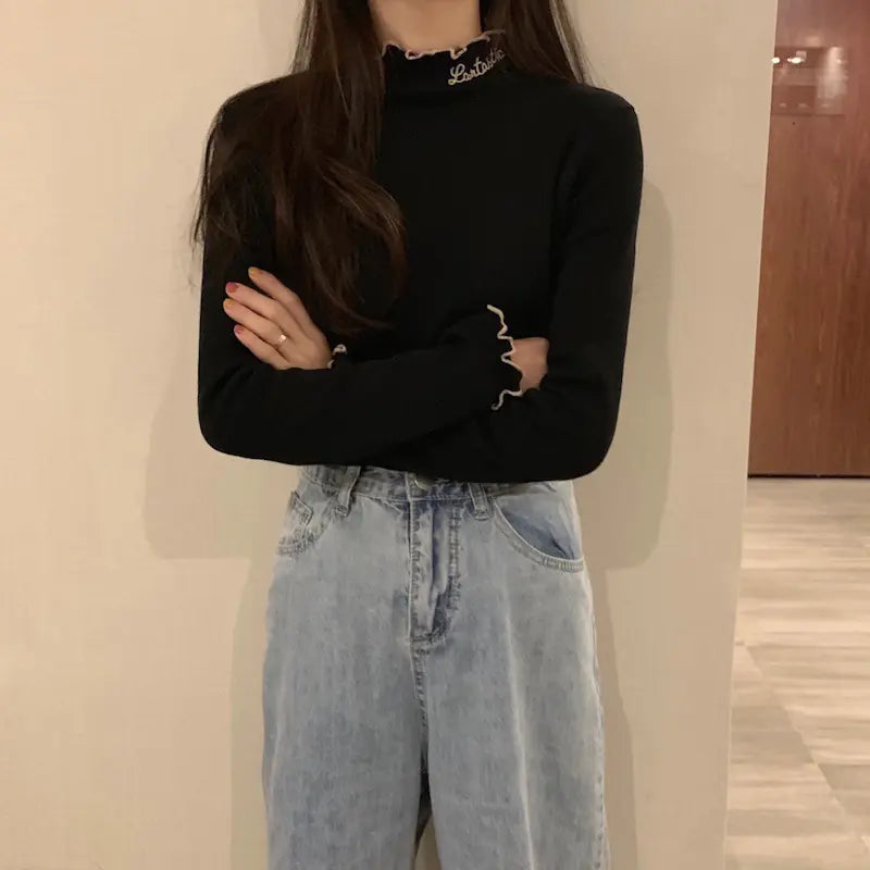 Korean Style Thick High Neck Embroidered Knit Top