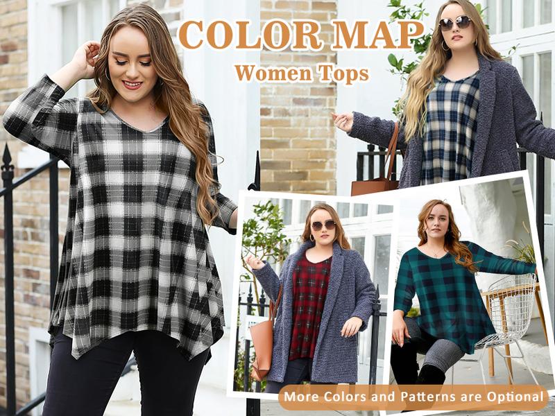 [V Neck Plus Size Tops for Women] - Plus size women's tunic tops 3/4 sleeve checkered shirt designed with irregular hem, v neck and classic buffalo plaid print. These plus size blouses for womens plaid shirt are perfect additions for your new season wardrobe.