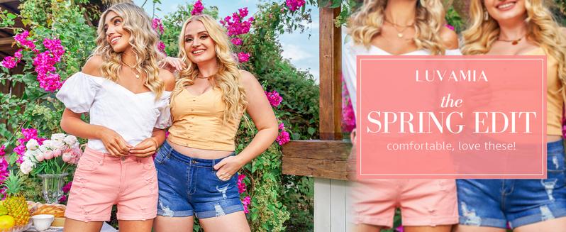 Summer denim shorts for women, luvamia stretchy jean shorts, ripped distressed shorts, folded hem detailing, fashion hot luvamia deinim shorts, luvamia high waist jean shorts, classic 5 pockets, zipper and button closure.
