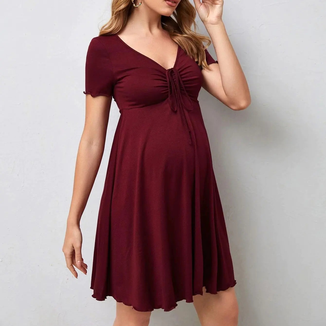 Introducing our stunning European and American Maternity Dress, designed to embrace your beautiful curves during pregnancy while keeping you stylish and comfortable! This gorgeous dress features a V-neck design and short sleeves, making it perfect for any occasion, from casual outings to special events.