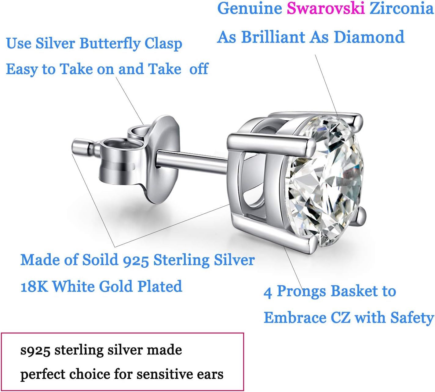 Men Stud Earrings, 18K White Gold Plated 4 Pong round CZ Earrings, 925 Sterling Silver Stud Earrings for Women/Men 3MM-8MM Available