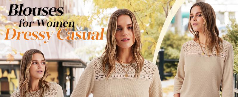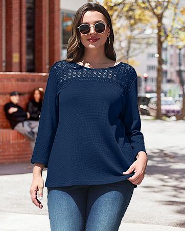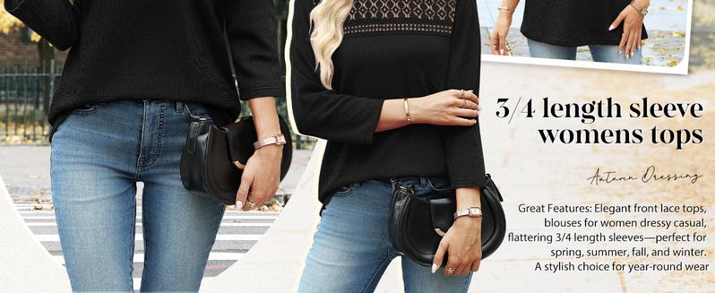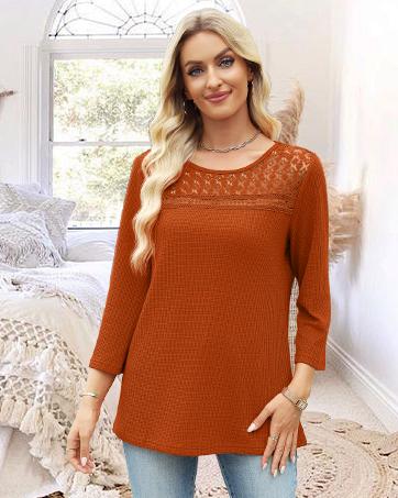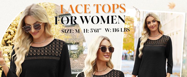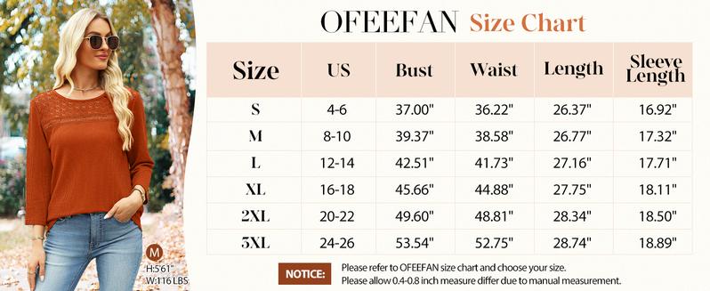 OFEEFAN Women Blouses Dressy Casual 3/4 Length Sleeve Tops plus Size Fall Clothes Lace Crochet Trendy Waffle Shirts