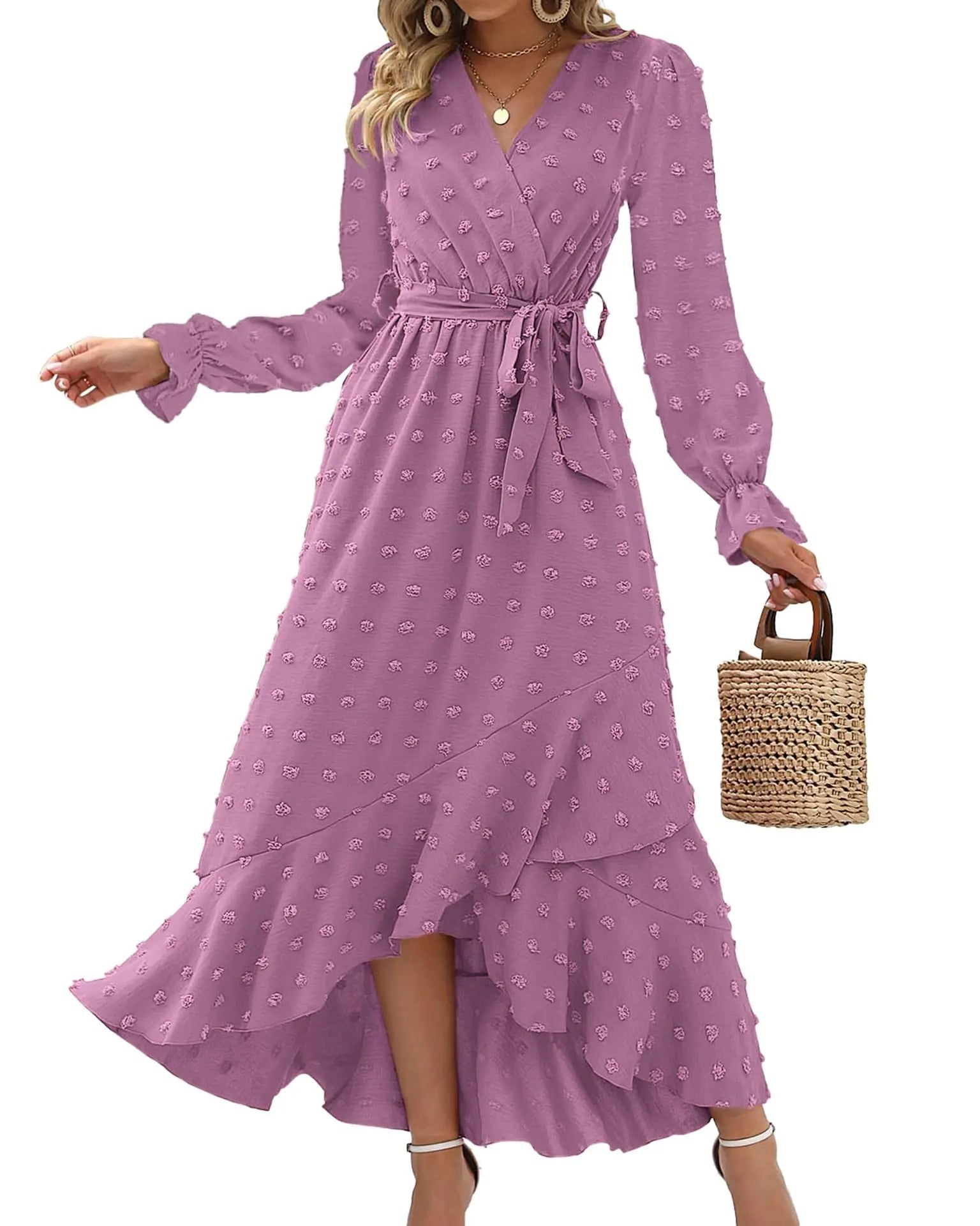 Get ready to turn heads at your next party with our stunning Women's Polka Dot Long Sleeve Dress. This elegant dress features a classic polka dot pattern in a gorgeous purple hue, making it the perfect choice for any festive occasion.